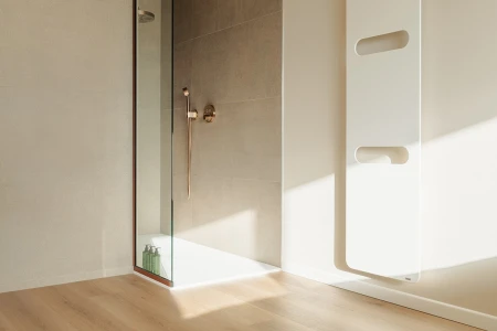 Thanks to their sturdy top layer and waterproof seams, Parquetvinyl floors can handle large amounts of water without any issues. Wet towels left on the floor a little too long or a soaked bath mat you forgot to hang up? No problem for a vinyl bathroom floor. You can even use our water-repellent MDF baseboards and other accessories in the bathroom with complete peace of mind.