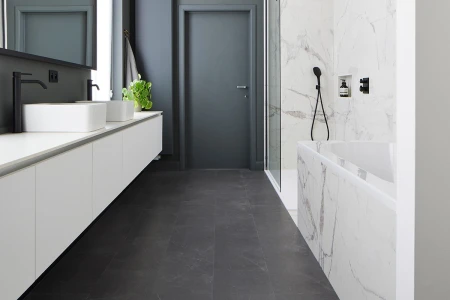If you're in love with a bathroom tile, Parquetvinyl is the perfect choice. Our selection of vinyl tiles will surprise you with features such as the elegant veining in our marble-look tiles or the minimalist look of our concrete-look tiles. Just as easy to install as vinyl planks and much warmer than ceramic tiles.