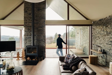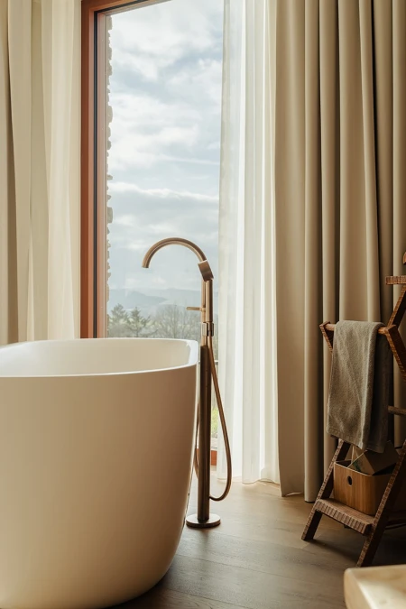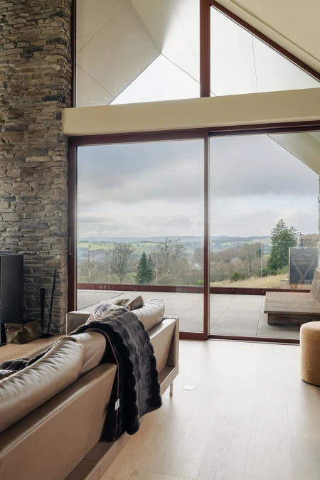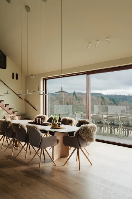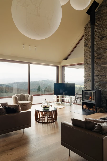 Upon arrival, the breathtaking view immediately catches the eye. Thanks to the large windows, the panoramic landscape is brought inside like a living painting. An open layout was deliberately chosen to allow light and space to take centre stage. Every detail in the interior reinforces that feeling of harmony with nature.