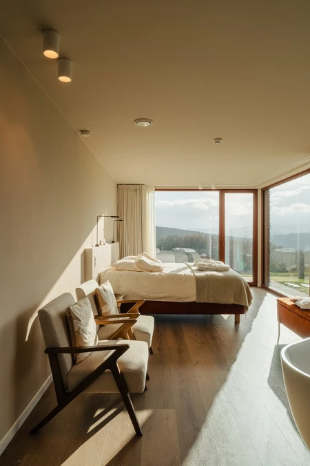 The home takes relaxation to the next level with a private wellness area. Guests can enjoy an outdoor sauna with views of the Ardennes forests, an indoor sauna for pure tranquillity, a Nordic bath under the starry sky and an infrared cabin for deep relaxation. The indoor wellness area was designed with the same attention to detail: natural materials, soft tones and a serene atmosphere that invites you to unwind.